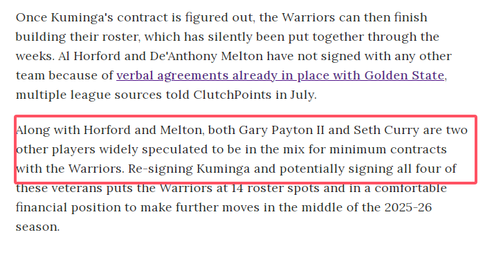 NBA记者布雷特·西格尔撰文写道,一旦库明加的合同敲定,勇士队就可以完成球队阵容的组建,这几周来,他们一直在默默地组建阵容。据多位联盟消息人士在7月份透露,艾尔·霍福德和德安东尼·梅尔顿由于与金州勇士队已经达成口头协议,尚未与任何其他球队签约。